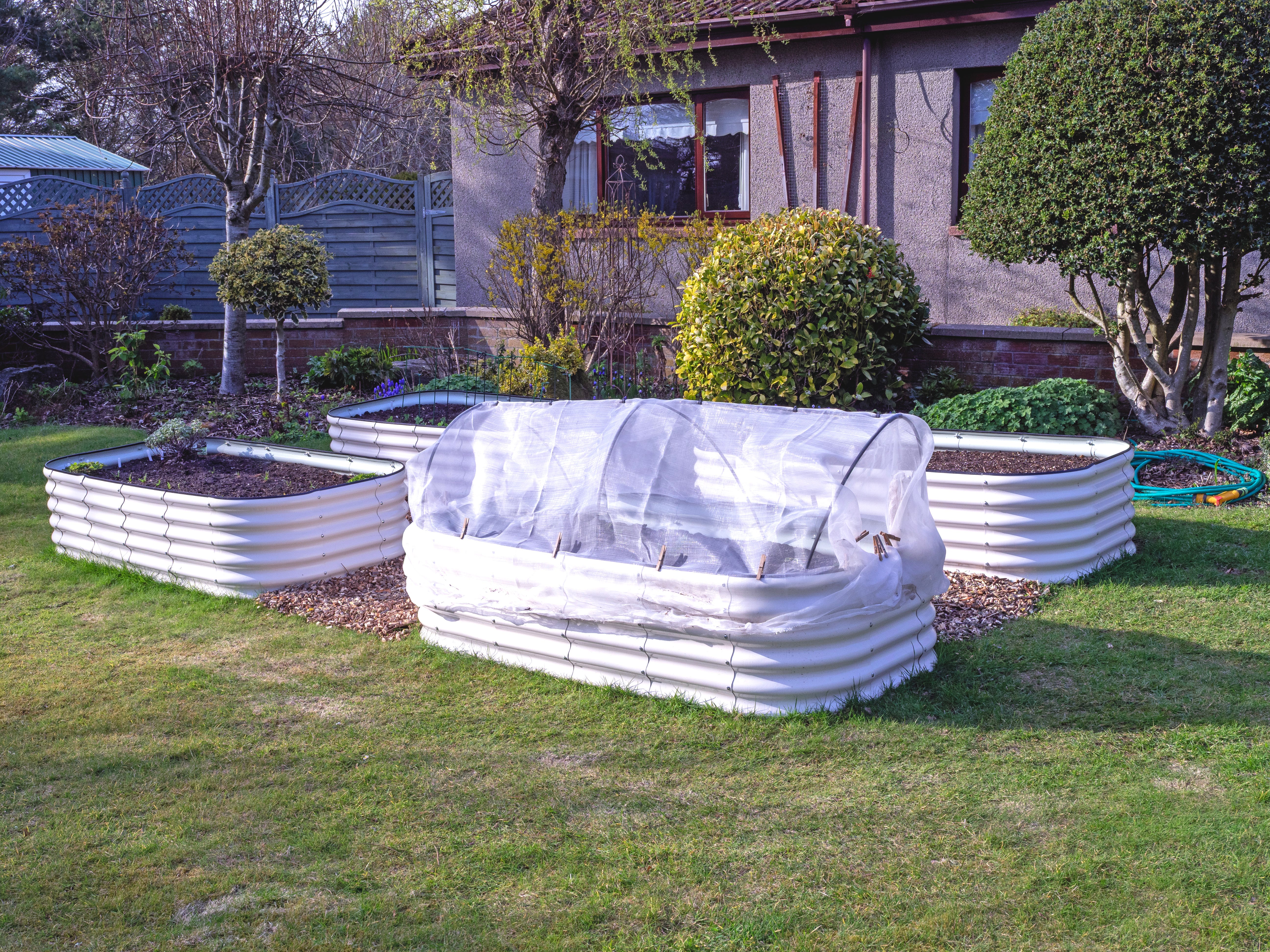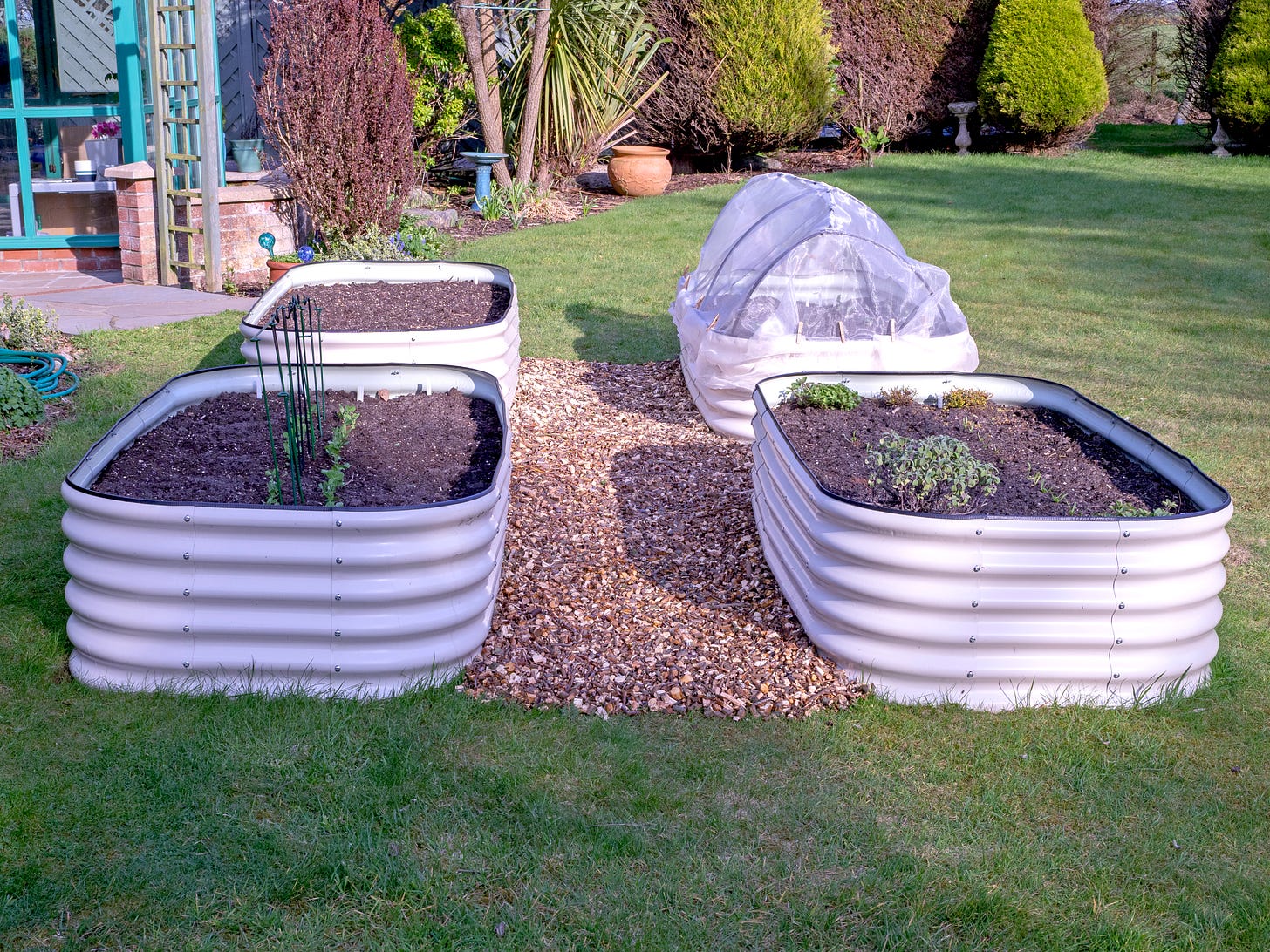 There is, however, a much smaller garden round the back that is sheltered by dense hedges and fences, and is an absolute sun trap. This area was mostly grass, with flower borders and shrubs along one side. We decided to convert this into our kitchen garden, and one of the first things we did after moving in was to install four raised beds.