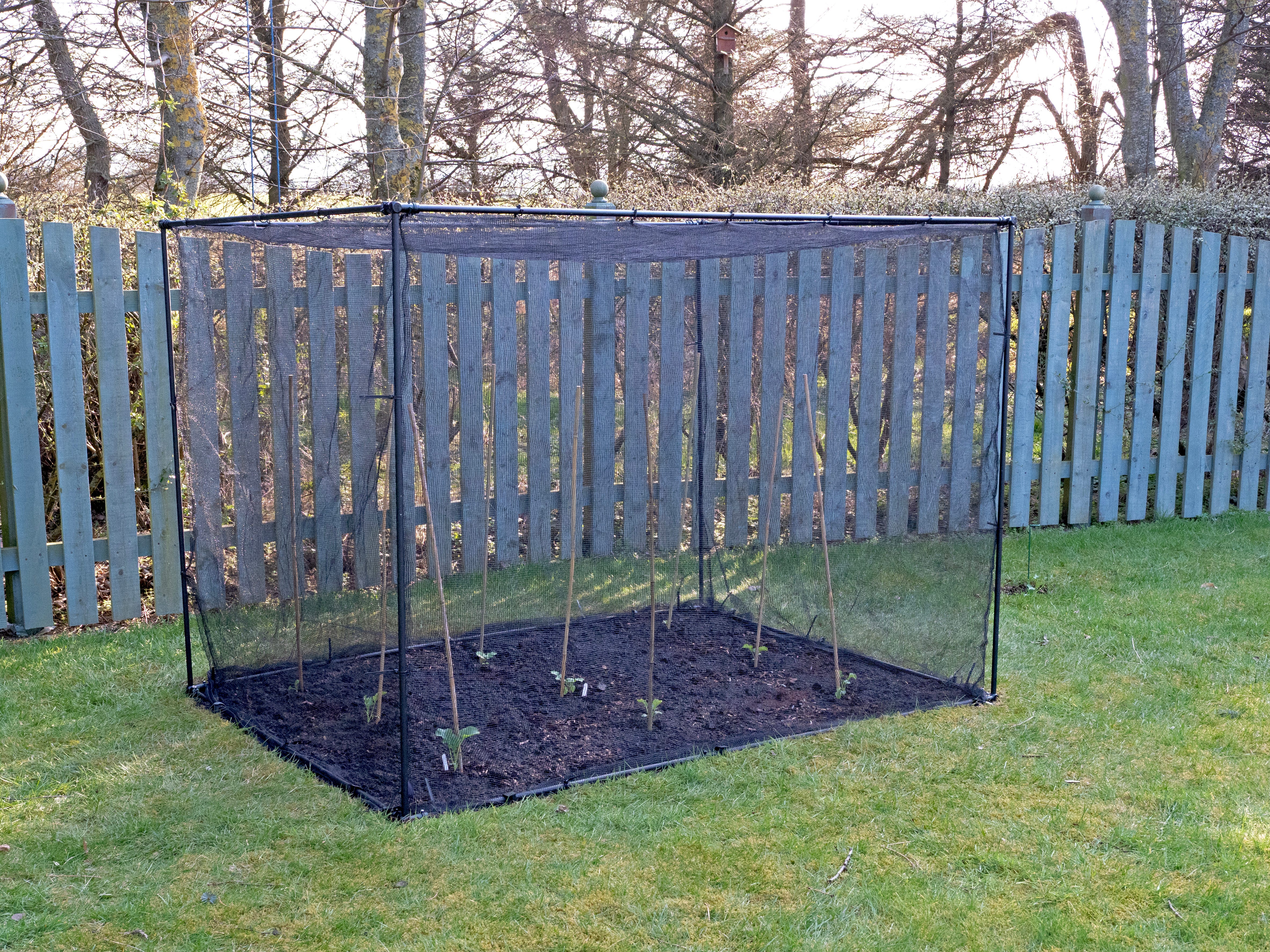 In this new bed I cut holes through the cardboard layer, and planted sprouting broccoli and Brussel sprout seedlings through the holes. Stakes were added to support the plants when they grow. The bed was then covered with a vegetable cage we brought with us from our previous home. This was our first attempt at sheet mulching, and I am happy with the result.