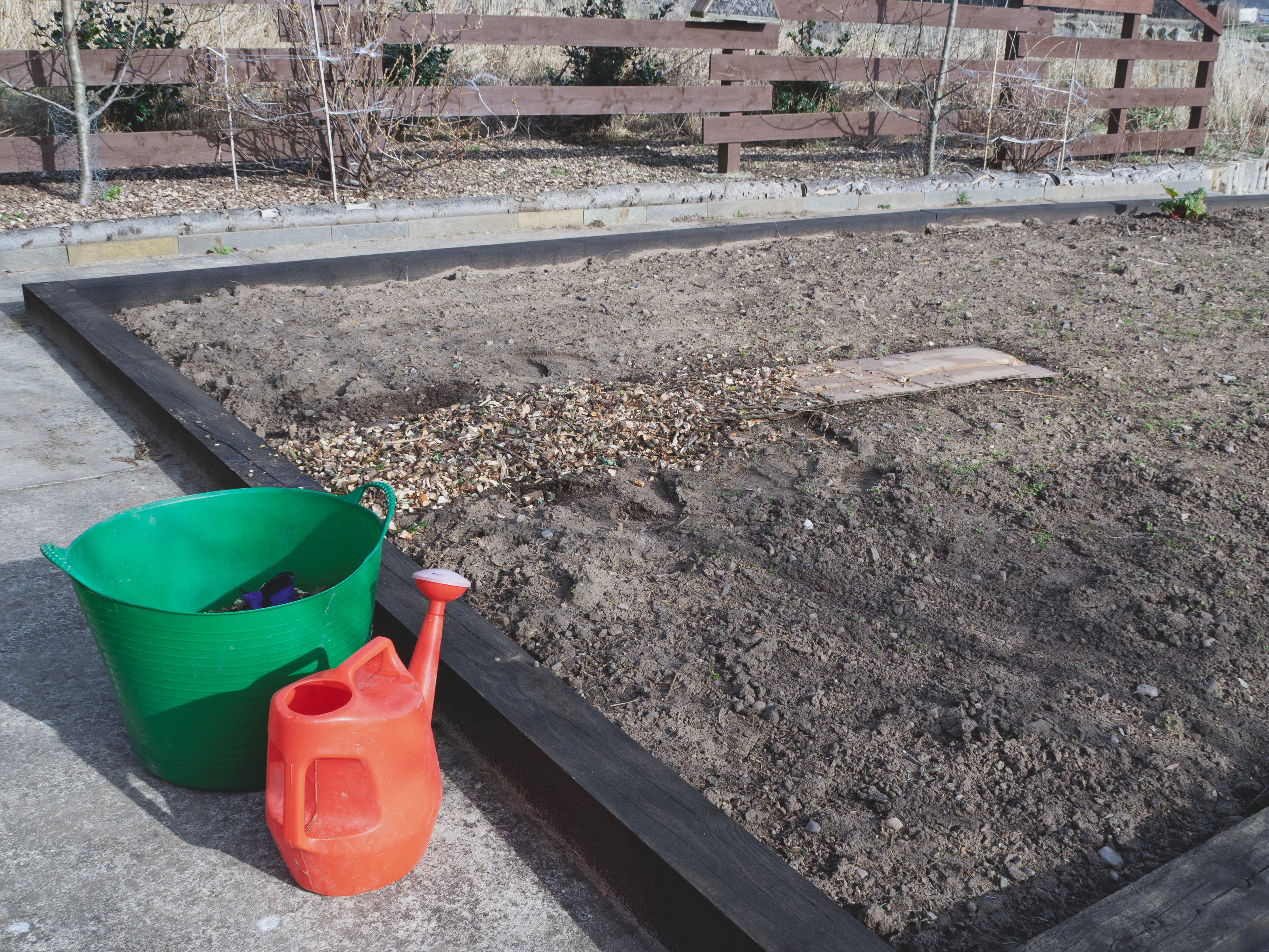 After completing the day’s planting in the raised beds, I shift my attention to the first of our beds created using sheet mulching. Like the paths mentioned above this was created using layers of cardboard laid over the grass. The cardboard was watered thoroughly, and then covered with a mixture of top soil and compost.