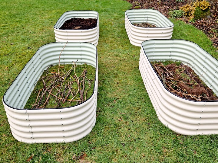 These took a lot of filling. We used the turf removed when we planted the trees in our new orchard, fallen branches, leaves and pine needles from around the garden, vegetation skimmed from the surface of the pond, and many bags of homemade compost which we brought with us from our previous home. We also had a bulk delivery of vegetable top soil to finally get the raised beds full and ready for planting. Here are a couple of photos from February when we had just started filling the beds.
