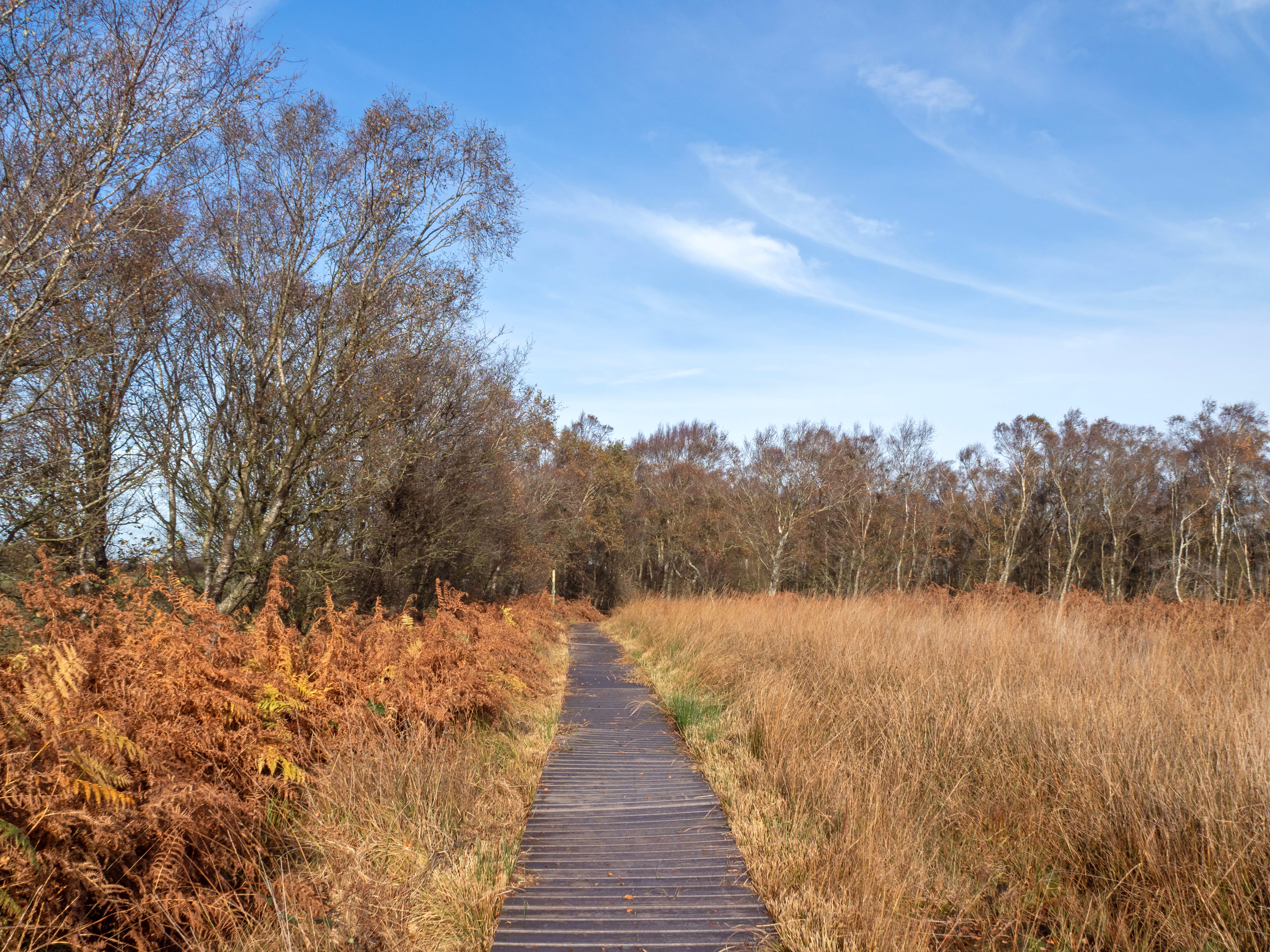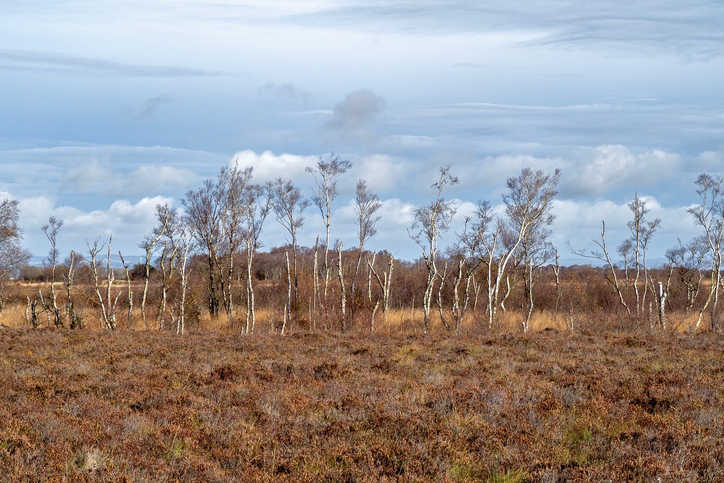 Just before the end of the boardwalk is a copse of silver birch trees, many damaged by the frequent strong winds in this exposed area.