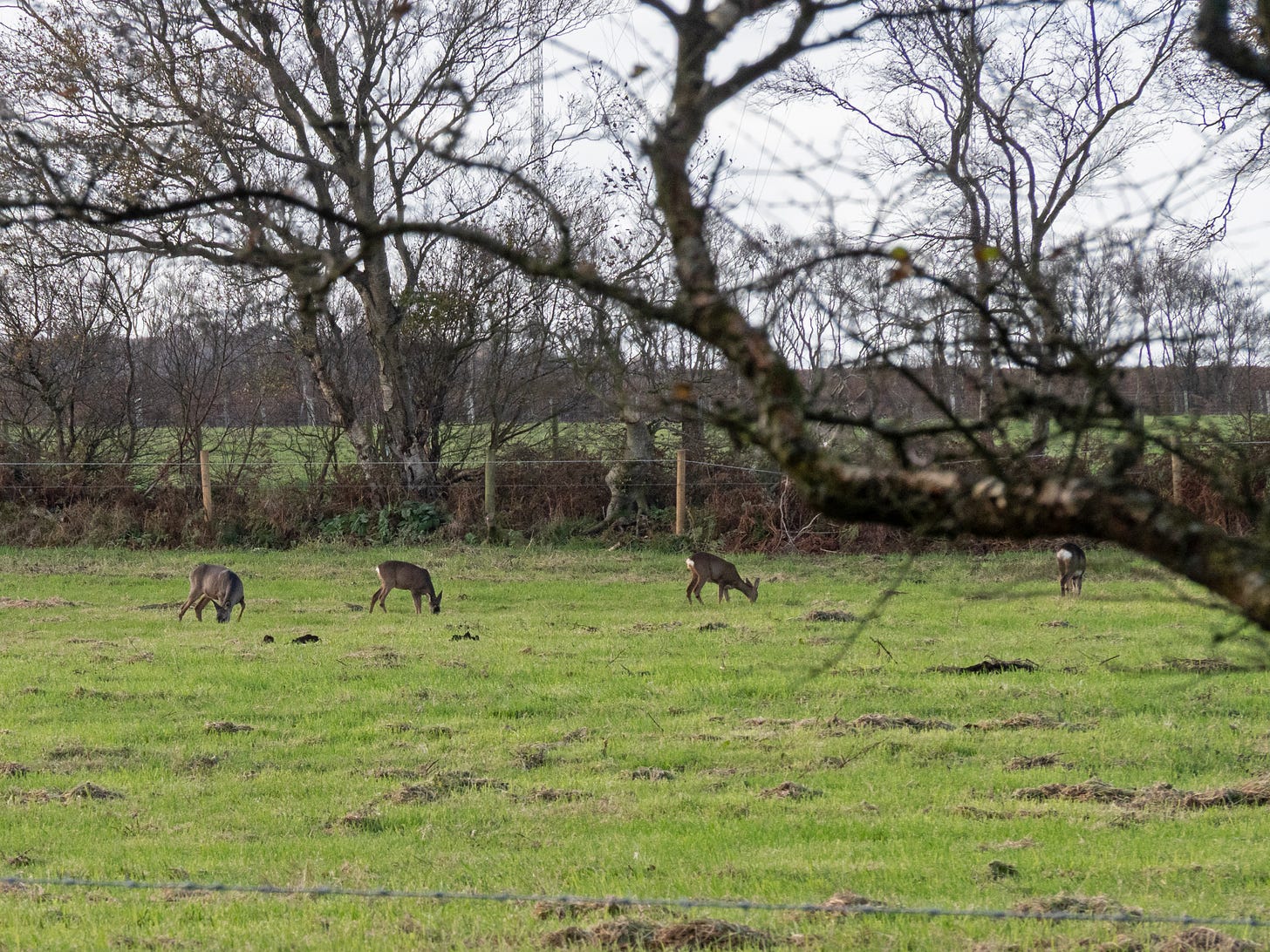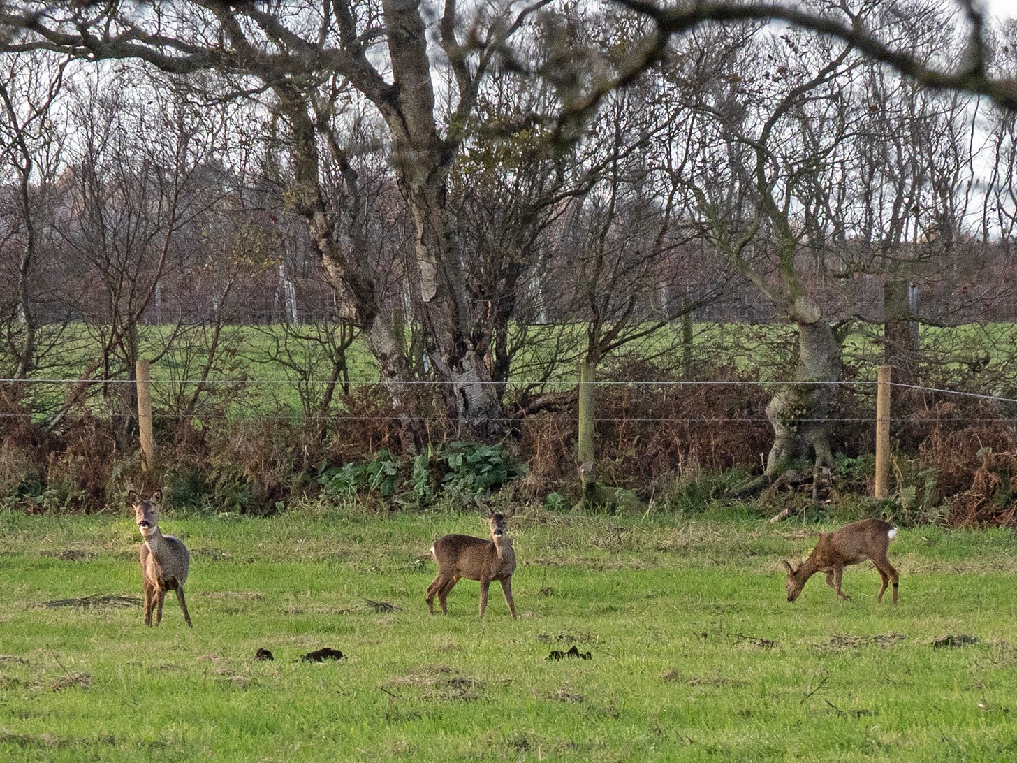 From the main hide you can do a short loop back to the car park, but on this trip we opted to do the longer loop which heads off through the peat bog. The trail first skirts around some fields, where we were lucky to see some roe deer grazing.