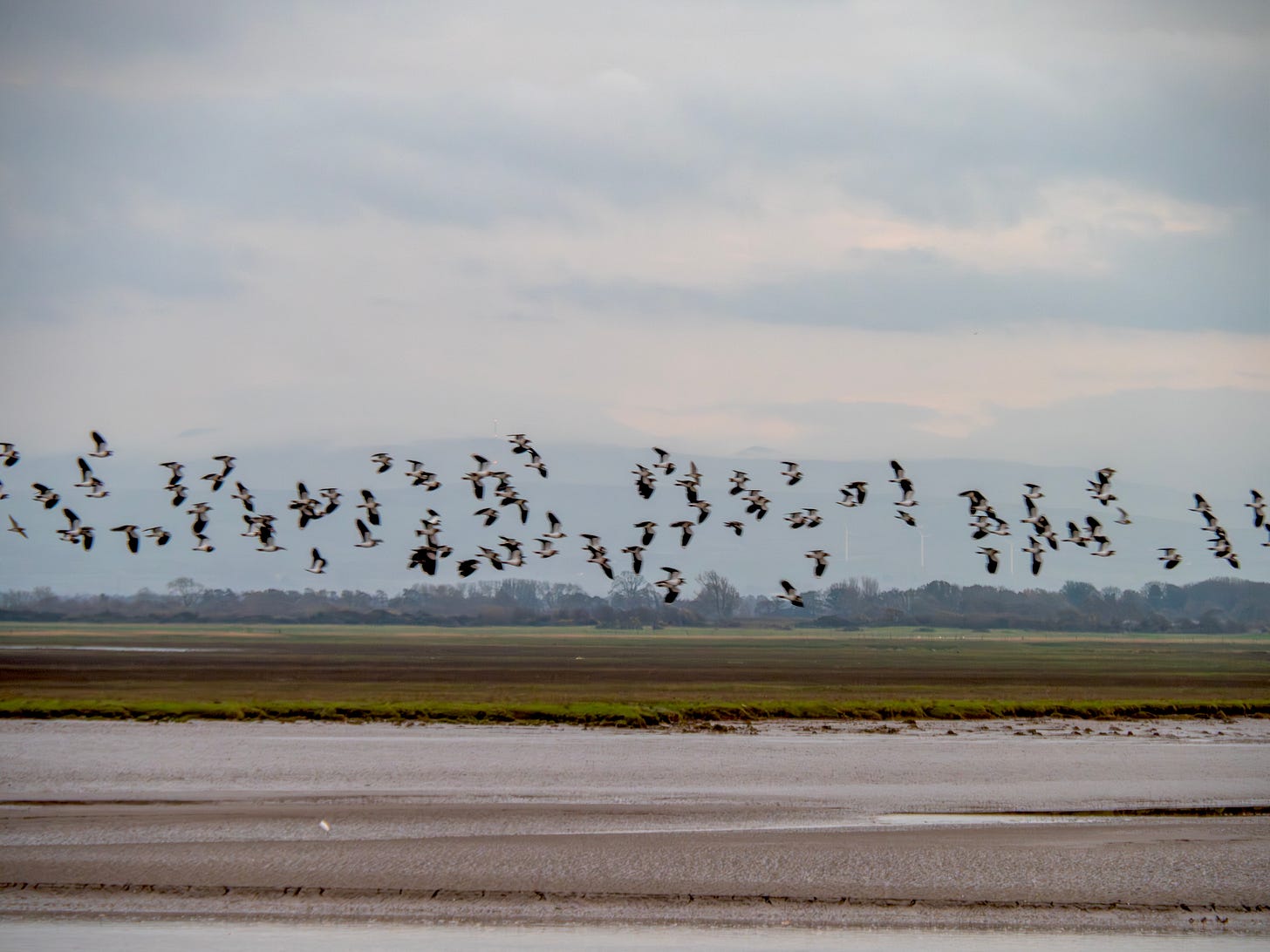 We arrived back at the car park intending to use a picnic table for our lunch. But a large group had just arrived, so we opted instead to drive to one of several laybys overlooking the saltmarsh. This proved to be a good choice, as a convenient bench allowed us to watch barnacle geese grazing on the saltmarsh, and flocks of lapwings flying past as the tide came rushing in. A lovely end to our short morning walk.