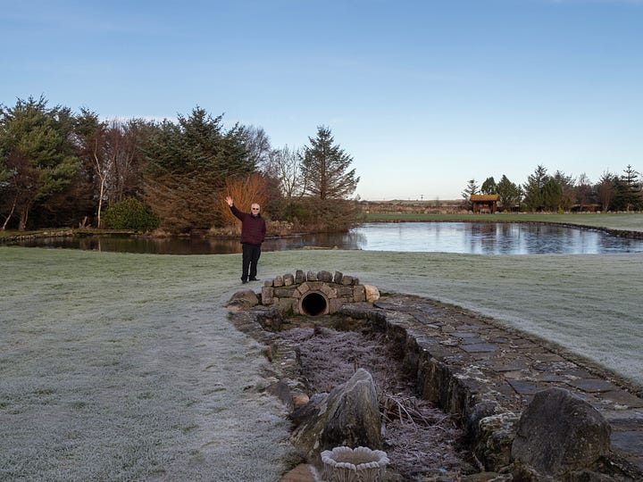 The two photos below show a culvert which takes rainwater from the property to the pond. The first shows Matt on the frosty morning we took possession, and the second shows the culvert this morning. What a difference two weeks can make!