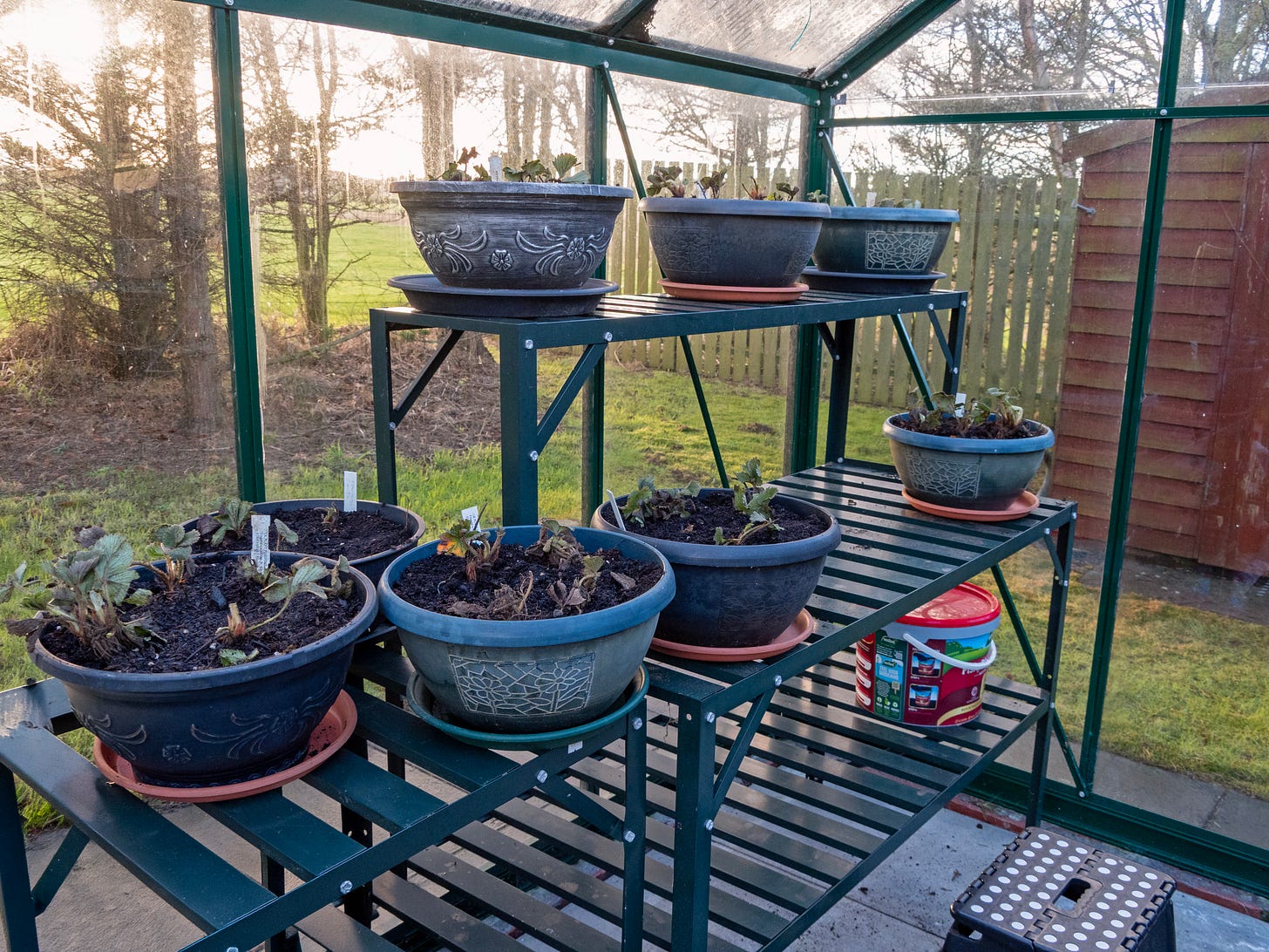But chard, kale, lettuces, spinach, beans, peas, carrots, onions, etc. will all grow in partial shade - just not as quickly or productively as in sun. Tomatoes, peppers, aubergines and chillies will have to be limited to what I can fit in the greenhouse (which of course is now almost stuffed with strawberry plants!). Perhaps another year we will think about a second greenhouse, or even a polytunnel, if funds permit.
