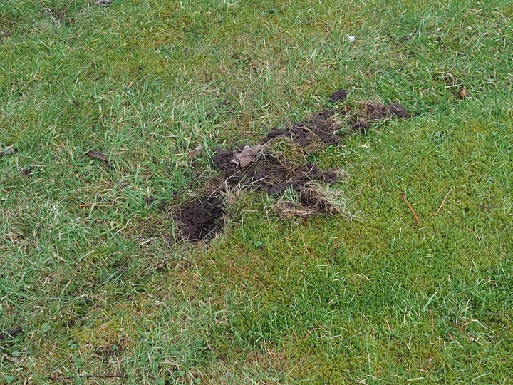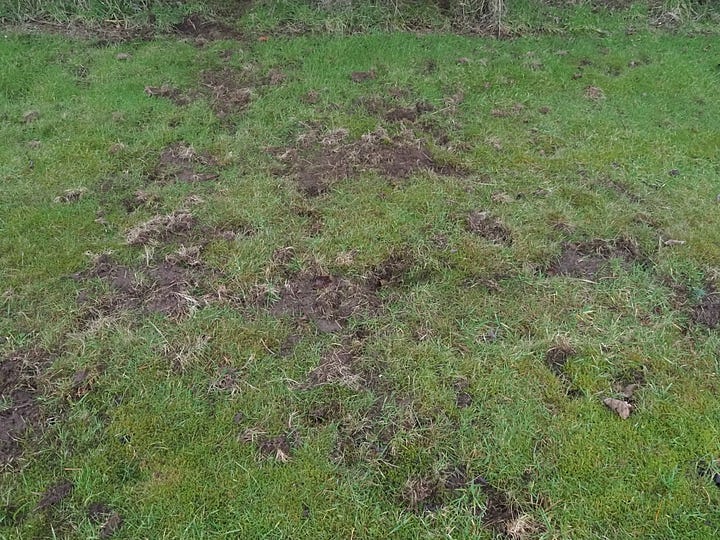 The next day we started noticing lots of scrapes and holes in the grass. The more we looked, the more we found, and new ones have been appearing every night since we arrived. Quick research revealed that these are snuffle holes made by foraging badgers looking for worms and grubs. Fantastic - badgers in the garden!